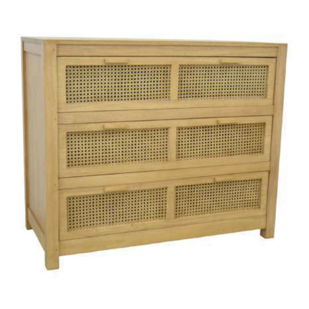 เติมเต็มบรรยากาศธรรมชาติและความอบอุ่นให้กับบ้านของคุณด้วย ตู้ลิ้นชักไม้ 3 ชั้น รุ่น MD9708 ดีไซน์เรียบหรู มาพร้อมหน้าบานลายหวายที่ช่วยเพิ่มเสน่ห์ให้กับเฟอร์นิเจอร์ทุกชิ้น ผลิตจากไม้แท้คุณภาพสูง แข็งแรง ทนทาน ให้สัมผัสที่อบอุ่นและมีเอกลักษณ์ เหมาะสำหรับการจัดเก็บเสื้อผ้า ของใช้ส่วนตัว หรือเอกสารต่าง ๆ ขนาด 100x50x84.6 ซม. ตอบโจทย์ทั้งด้านฟังก์ชันและสไตล์