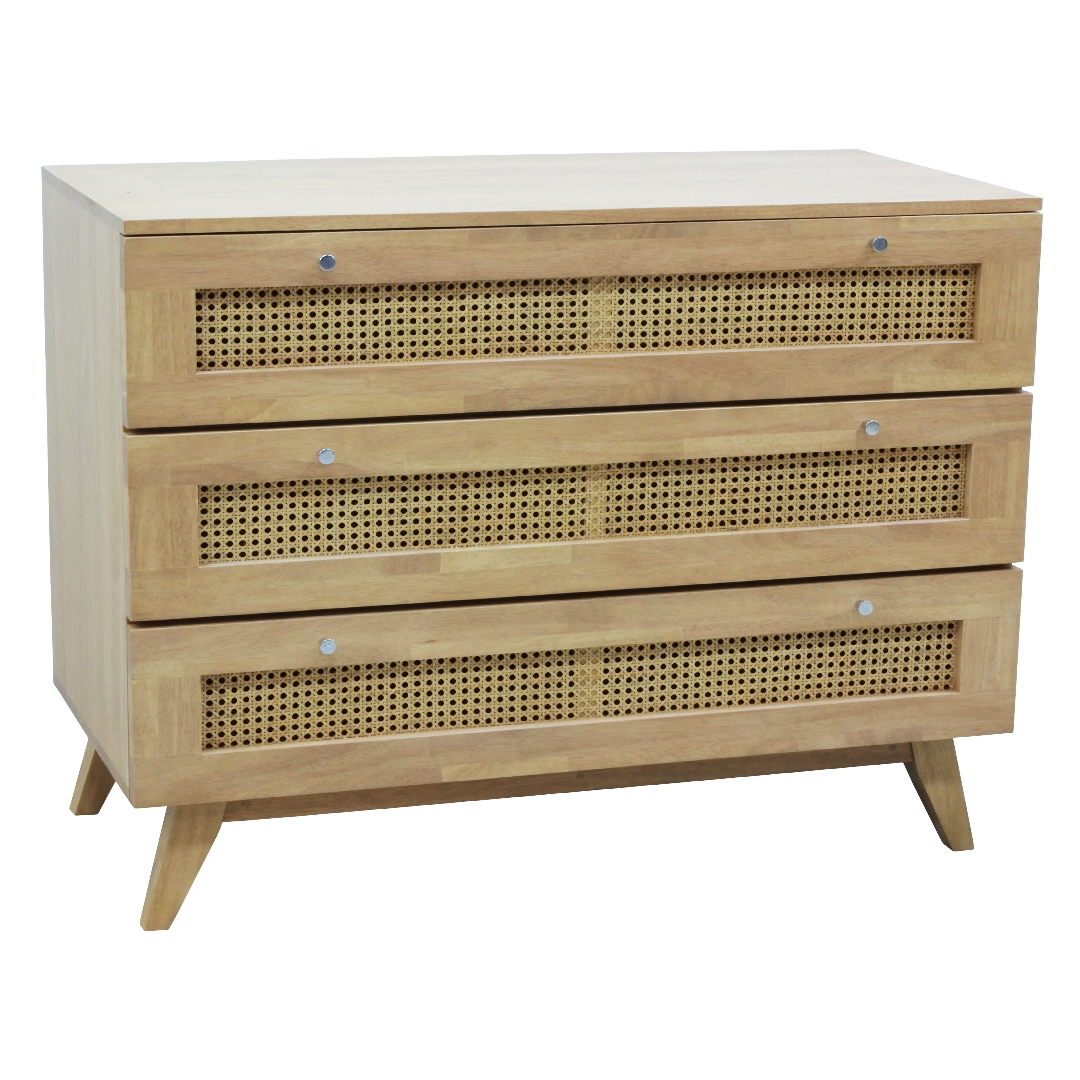 เพิ่มความเรียบง่ายและประโยชน์ใช้สอยให้กับบ้านของคุณด้วยตู้ลิ้นชักไม้ 3 ชั้น รุ่น MD9759KD ขนาด 100x48x80 ซม. ผลิตจากไม้แท้คุณภาพสูง แข็งแรง ทนทาน พร้อมลิ้นชักลวดลายหวายที่เพิ่มความเป็นธรรมชาติและสไตล์ที่โดดเด่น