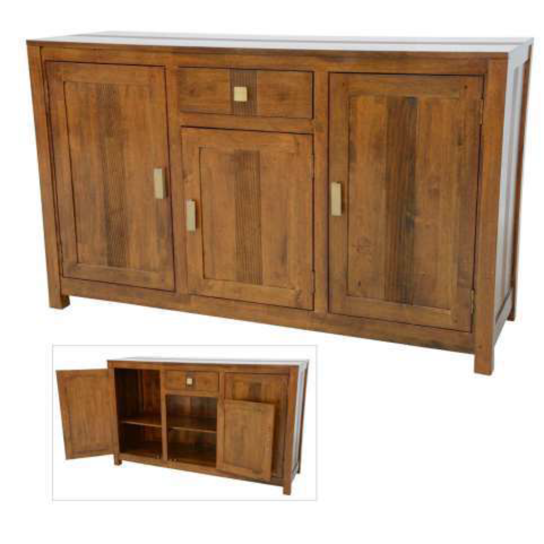ตู้ไซด์บอร์ดไม้สไตล์วินเทจ รุ่น MD9185 เฟอร์นิเจอร์ที่ลงตัวสำหรับการจัดเก็บและตกแต่งบ้าน ด้วยดีไซน์คลาสสิกที่มาพร้อมความสะดวกในการใช้งาน ผลิตจาก ไม้แท้คุณภาพสูง แข็งแรง ทนทาน พร้อมให้ลวดลายไม้ธรรมชาติที่สวยงาม มาพร้อม 3 บานประตู และ 1 ลิ้นชัก ที่ช่วยให้สามารถจัดเก็บของใช้ได้อย่างเป็นระเบียบ ขนาด 140x45x85 ซม. เหมาะสำหรับตกแต่งห้องนั่งเล่น ห้องรับแขก หรือห้องอาหาร